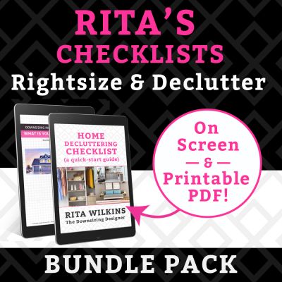 Save money with this bundled discount. A combination of Rita’s most popular checklists. The Rightsize Checklist for Downsizing and the Quickstart Guide to Decluttering.